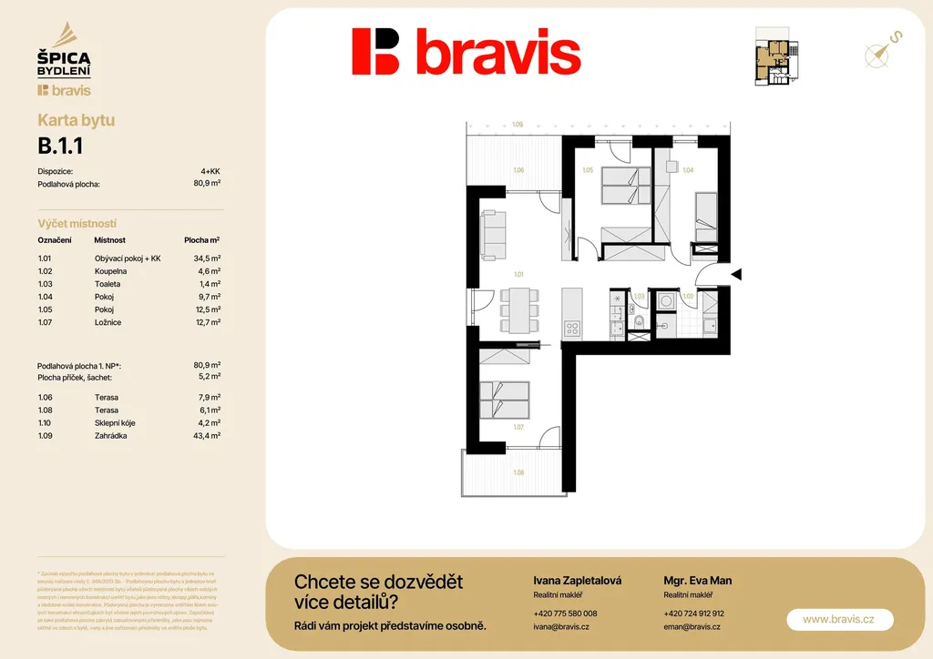 Nabízíme exkluzivní bytovou jednotku 4+kk (bytová jednotka B1-1) v novém projektu Špica bydlení — byt umístěný v přízemí nízkoenergetického bytového domu B, kde se nachází pouze 5 bytových jednotek. Celková podlahová plocha 80,9 m2 s terasou 14 m2, zahrádkou 43,4 m2, sklepem a vlastní parkovací stání, to vše v ceně bytu.