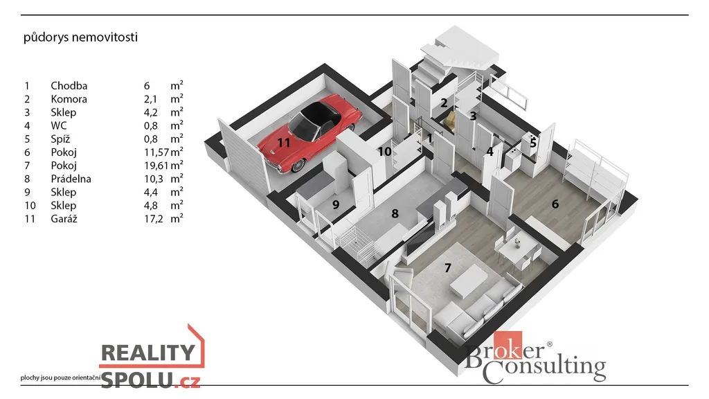 Přízemí: jedna samostatná místnost + praktické odkládací / technické místnosti, ideální jako zázemí domu, kancelář, sklad nebo společné prostory