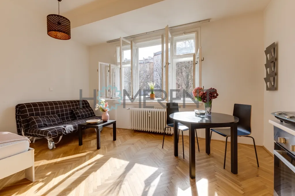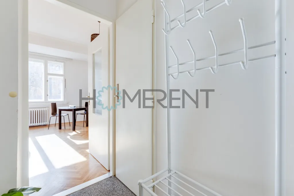 Byt je orientován do klidného vnitrobloku, díky čemuž nabízí ticho a dostatek denního světla. Velká původní okna, vysoké stropy a dřevěné podlahy podtrhují příjemný předválečný charakter bytu. I přes menší výměru působí byt vzdušně, útulně a nabízí dostatek prostoru pro pohodlné bydlení.