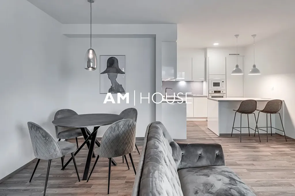 Dispozice jednotky se skládá z obývacího pokoje s vybavenou kuchyňskou linkou, jídelní soupravou, gaučem a Smart TV. Byt má koupelnu se sprchou, umyvadlem, WC, pračkou. Ložnice je vybavena posteli, vystavenou skříní, psacím stolem.