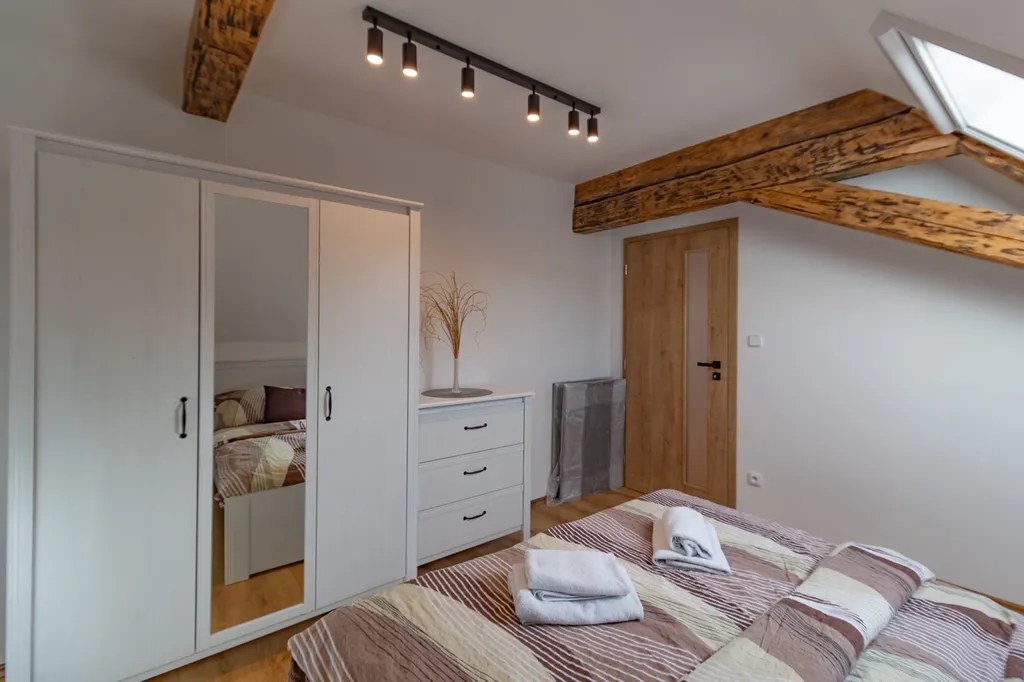 Apartmán č. 2. o podlahové ploše 48,3 m2 je kompletně moderně a vkusně vybavený jak elektrospotřebiči, tak nábytkem. Vnitřní dispozice 2+kk v 1. NP: vstupní předsíň, kuchyňský kout - kuchyňská linka zn. Oresi ( s el. horkovzdušnou troubou s indukční deskou, mikrovlnnou troubou, lednicí s mrazákem zn. Mora). Jídelní koutek s obývacím prostorem včetně nábytku a TV ; ložnice. Koupelna (se sprchovým koutem, umyvadlem, topným žebříkem a připojením k pračce, baterie – Grohe, sanita - Geberit), samostatné WC. V rámci rekonstrukce bylo provedeno zaizolování stropů, položeny protihlukové podlahy, plovoucí podlaha zn. Quick – Step a protihlukové stěny mezi apartmány, okna dřevěná s trojskly. Vytápění je řešeno klimatizací Haier - ovládanou tel., vjezdová brána ovládaná tel. a kódovým systémem, samostatné připojení wifi, kamerový systém. K bytu náleží vlastní venkovní prostor k posezením, kój (5m2), jedno parkovací stání u domu a společné venkovní prostory k odpočinku. Voda čerpána z vrtané studny, odpad řešen ČOV. V rezidenci je dále k dispozici využití sauny a fitness.