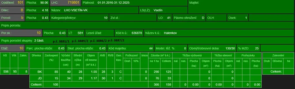 - p.č. 3887/2 vedená jako lesní pozemek o celkové výměře 262 m2, z toho vlastníme podíl 3/7 tedy 112 m2 (stáří lesa 105 let - zastoupení dřevin buk, jedle).