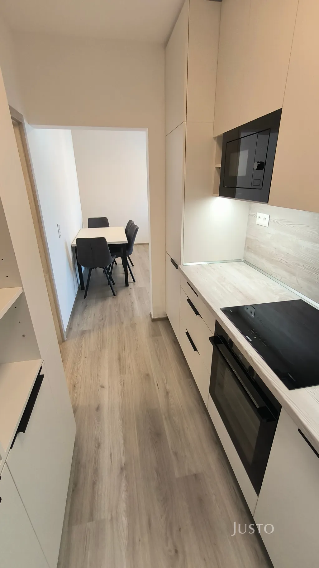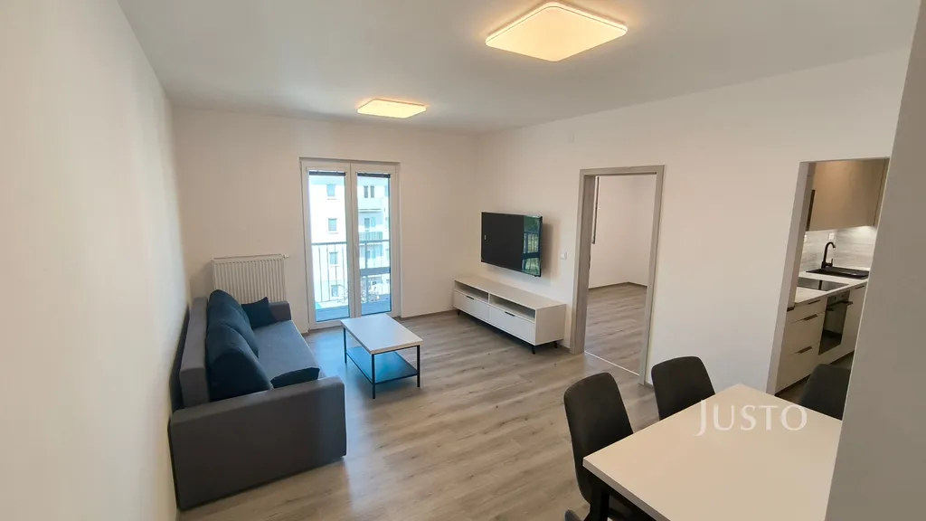 Interiér bytu je kompletně vybavený a navržený v příjemných světlých tónech. Kuchyňská linka je vybavena moderními spotřebiči, včetně lednice s mrazničkou, vestavěné trouby, varné desky a mikrovlnné trouby. Nechybí ani dostatek úložných prostor, praktické členění kuchyně a kvalitní povrchy, které oceníte při každodenním používání. Obývací část nabízí pohodlnou sedací soupravu, konferenční stolek, televizní stolek, televizi, jídelní stůl se židlemi a vstup na balkon, který poskytuje příjemný výhled a možnost posezení venku.