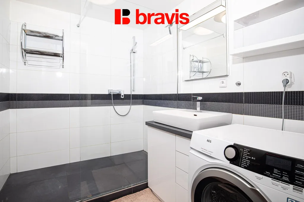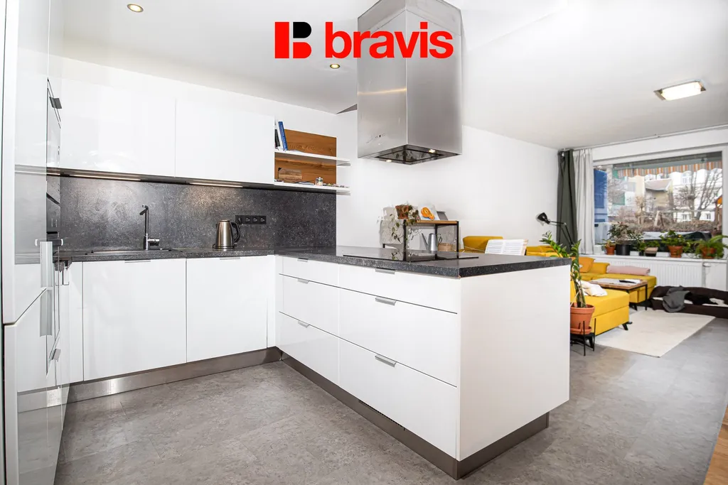 Dispozičně je byt velmi dobře řešen. Kuchyňská část je vybavena moderní kuchyňskou linkou se všemi vestavěnými spotřebiči – lednicí s mrazicím boxem, indukční varnou deskou, troubou, mikrovlnnou troubou, myčkou a digestoří.