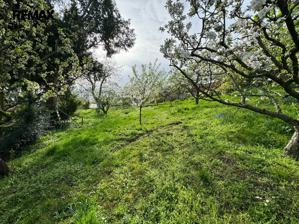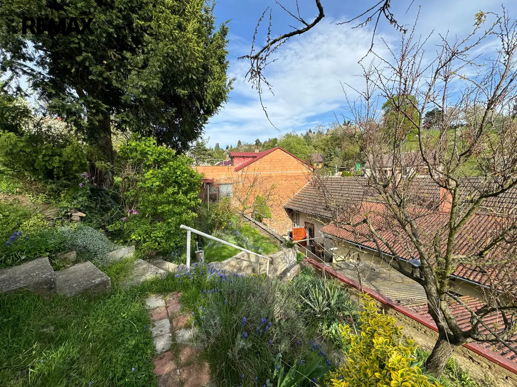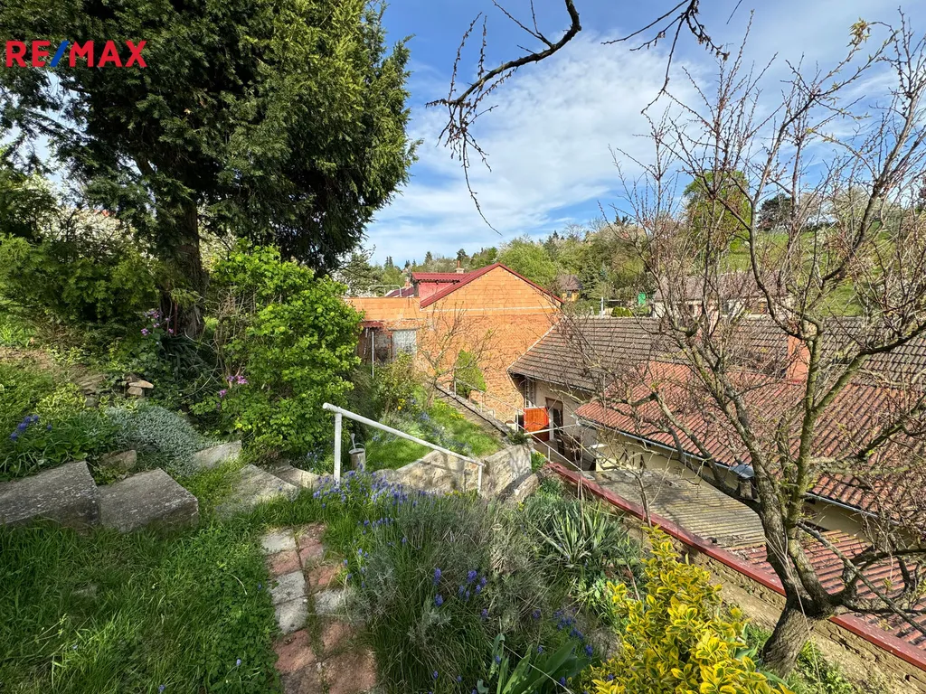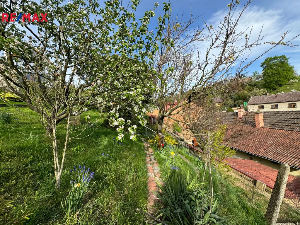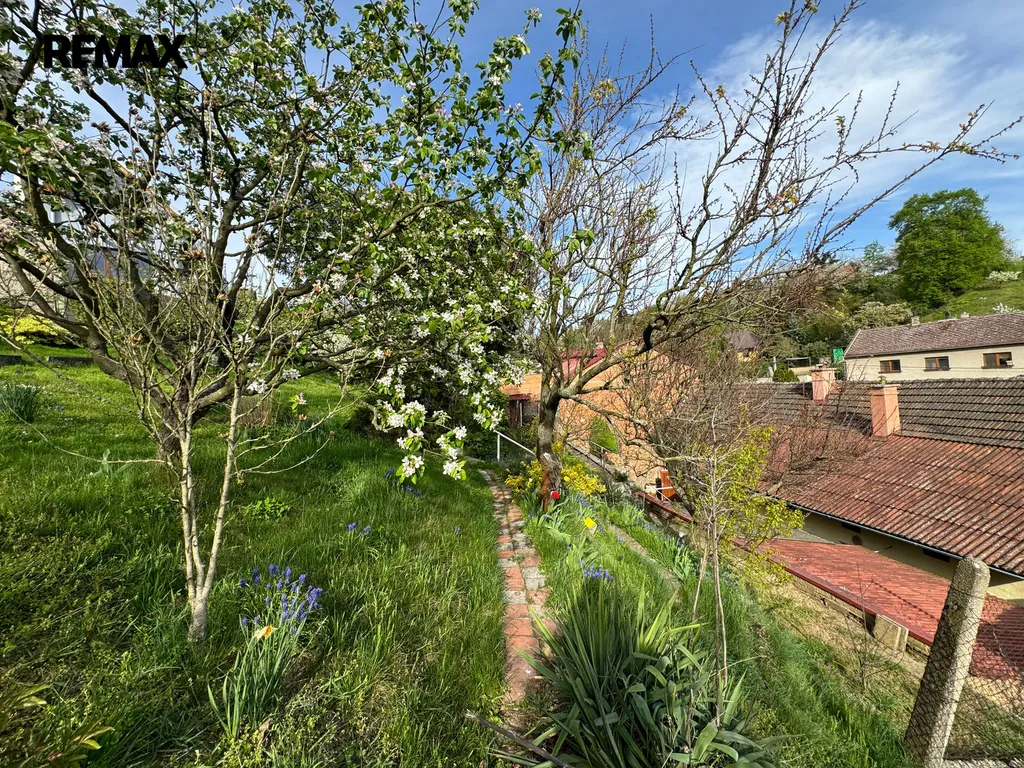 Z horní části zahrady je nádherný výhled do okolí. Na zahradě jsou ovocné stromy, okrasné keře a další okrasné květiny.