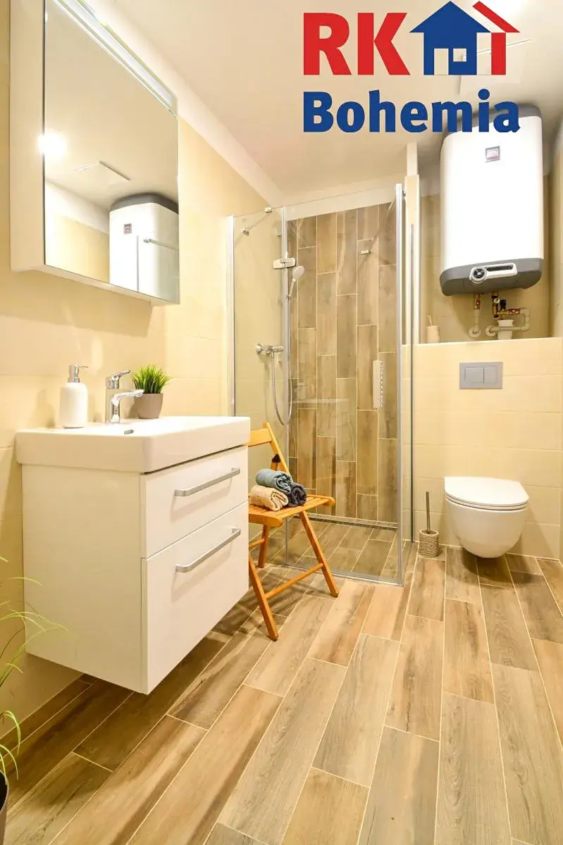 V koupelně se nachází sprchový kout, umyvadlo, WC TECE ONE s integrovanou bidetovou sprchou a příprava na pračku.