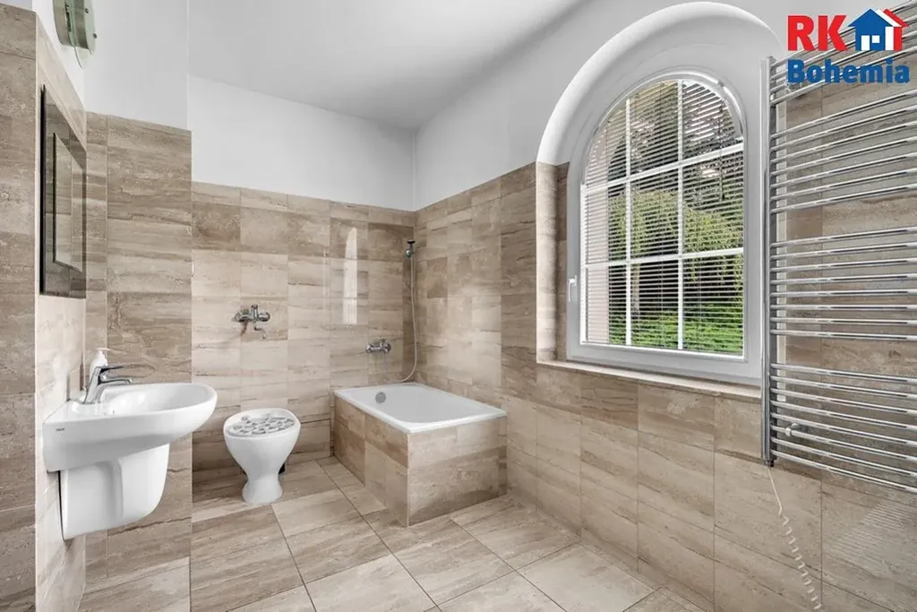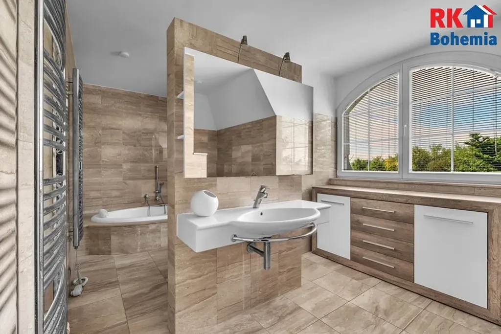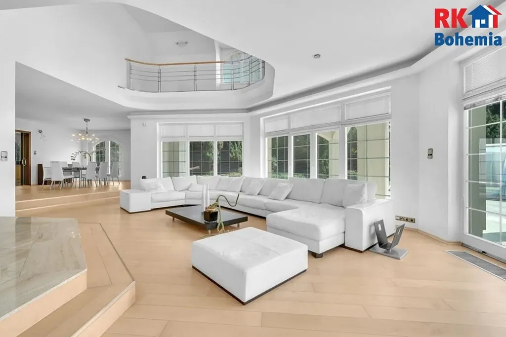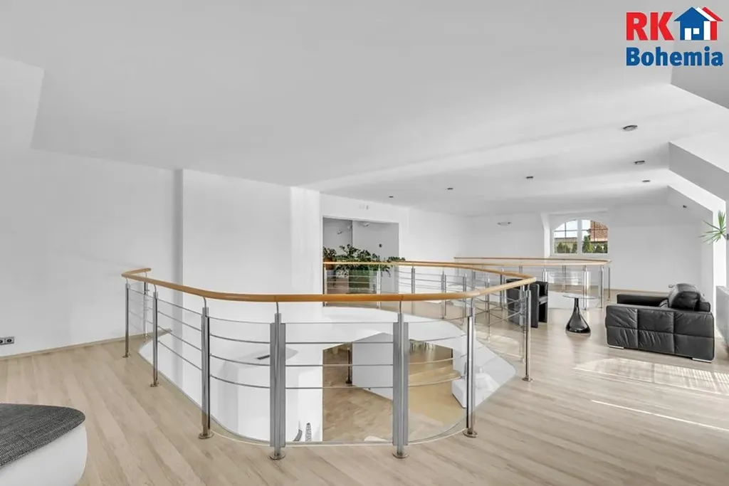 Bonusem je velmi citlivě upravená zahrada ze zavlažováním, se vzrostlými stromy a s travnatou plochou na heliport či tenisové kurty. Pozemek s vyhřívaným krytým bazénem a jezírkem velmi dobře doplňuje výjimečnost samotné stavby. Může sloužit pro rodinnou relaxaci a odpočinek a rovněž dokáže nabídnout potenciál v případě komerčního využití.