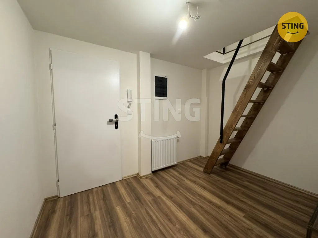 Nachází se ve 4. nadzemním podlaží revitalizovaného bytového domu. Dispozice bytu zahrnuje vstupní chodbu, obývací pokoj s kuchyňským koutem, spací část na galerii, koupelnu se sprchovým koutem a WC. Moderní kuchyňská linka je vybavena vestavěnými spotřebiči – kombinovanou troubou, digestoří, varnou deskou, myčkou nádobí a kombinovanou lednicí s mrazákem.