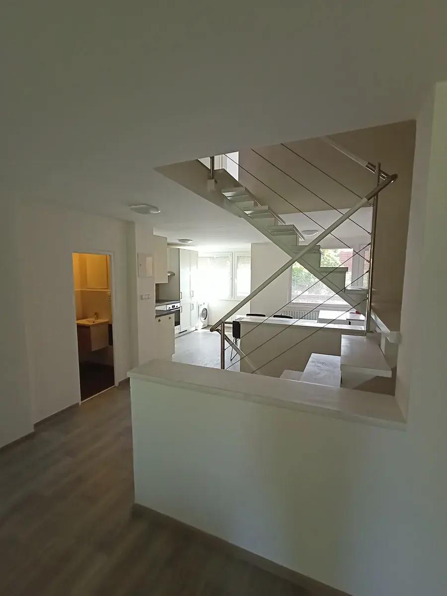 V prvním nadzemním podlaží se nachází zádveří, obývací pokoj (15,35 m²), koupelna, předsíň, šatna, chodba a garáž.