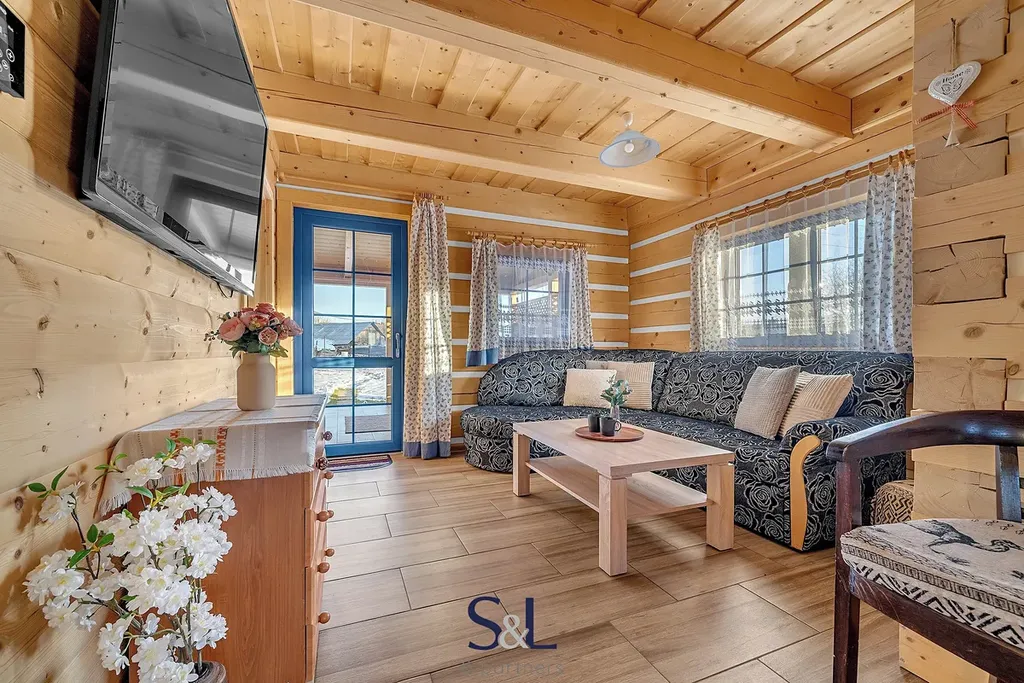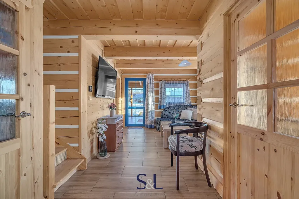 Interiér je řešen především v přírodních materiálech – stěny i půda jsou obloženy silnými srubovými palubkami a stropy jsou celodřevěné z překládaných prken, což zvyšuje tepelný komfort, akustiku i celkovou estetiku domu.