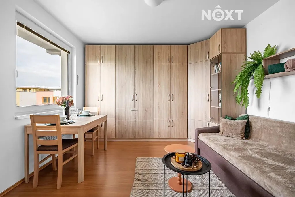 Dispozice bytu je velmi praktická: předsíň (11,3 m²), koupelna s toaletou a sprchovým koutem (6,2 m²), obývací pokoj s kuchyňským koutem (24,1 m²) a ložnice (13,9 m²). Další úložný prostor poskytují vestavěné skříně v předsíni i obývacím pokoji. K bytu patří také komora na patře (1,4 m²) a balkon (5,5 m²) orientovaný na západ, ideální pro večerní odpočinek při západu sluníčka.