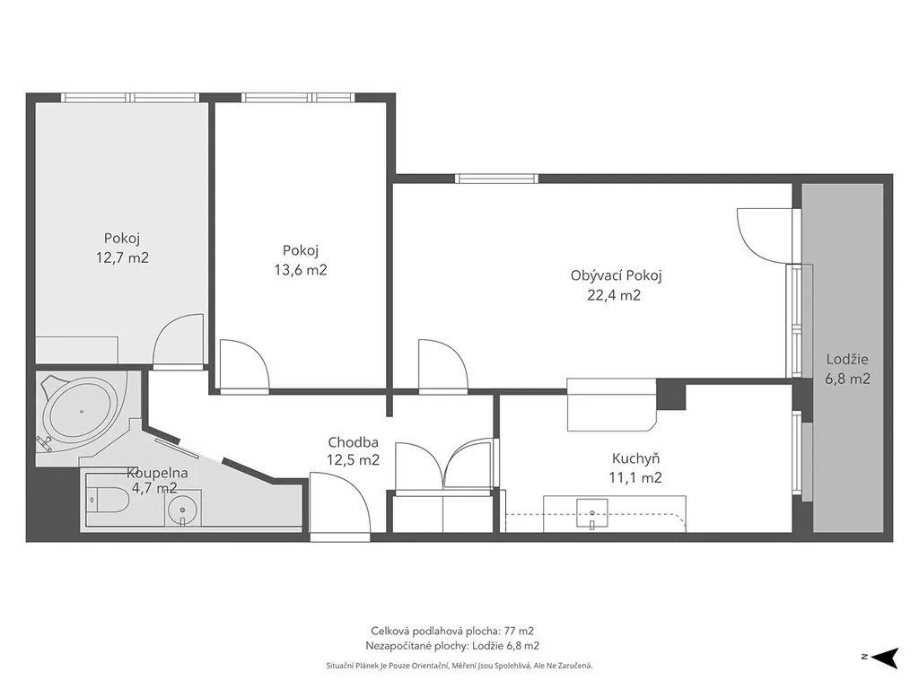 Byt má praktickou dispozici s oddělenými obytnými i klidovými částmi. Skládá se z kuchyně, tří pokojů, koupelny s WC a prostorné chodby, která nabízí dostatek místa pro úložné řešení. Součástí bytu je také lodžie.