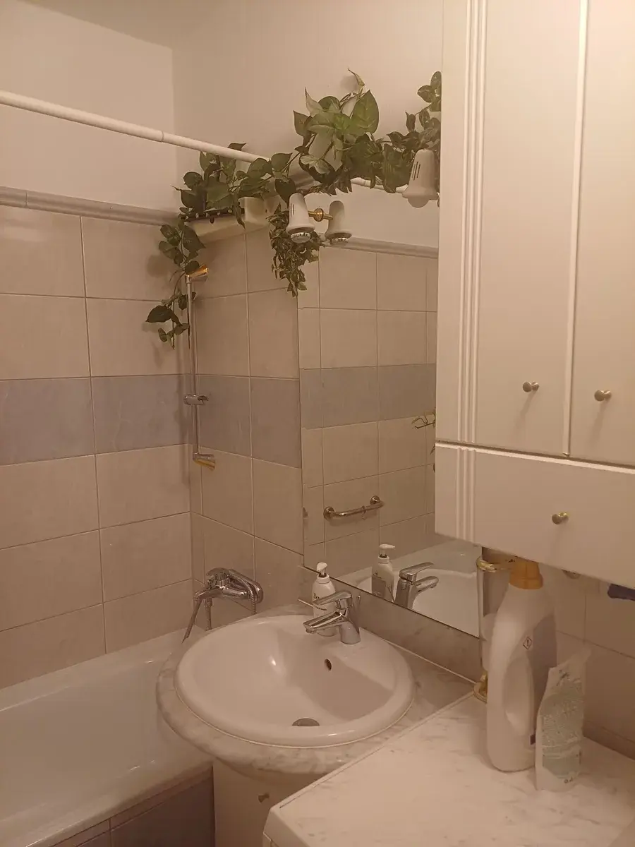 Vstupními dveřmi do bytu se vejde do předsíně s vestavěnými dveřmi, odkud je vstup do koupelny s vanou, pračkou, umyvadlem a otopným žebříkem. Dále je vstup na samostatné wc. Z předsíně je vstup do ložnice s dvoulůžkem, čtyřdílnou šatní skříní a skříní s televizí. Z předsíně je vstup do obývacího pokoje s kuchyní. V kuchyňské lince do L je elektrický sporák s el. troubou, dřez, velká lednice, spižírna, mikrovlnka, kávovar. Kuchyně je kompletně vybavená nádobím. V obývací části pokoje je sedací souprava s úložným prostorem, konferenční stolek, taburet, obývací nábytková stěna, koberec.
