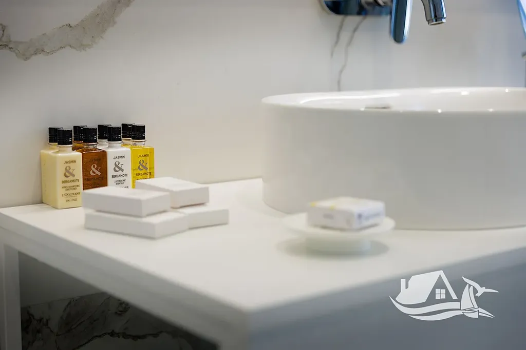 Horní patro je srdcem domu s otevřenou kuchyní, jídelnou a obývacím pokojem plným světla díky velkým oknům. Je zde samostatná toaleta a dvě terasy – zastřešená i otevřená s panoramatickým výhledem na moře, ideální pro rodinné chvíle i relaxaci.