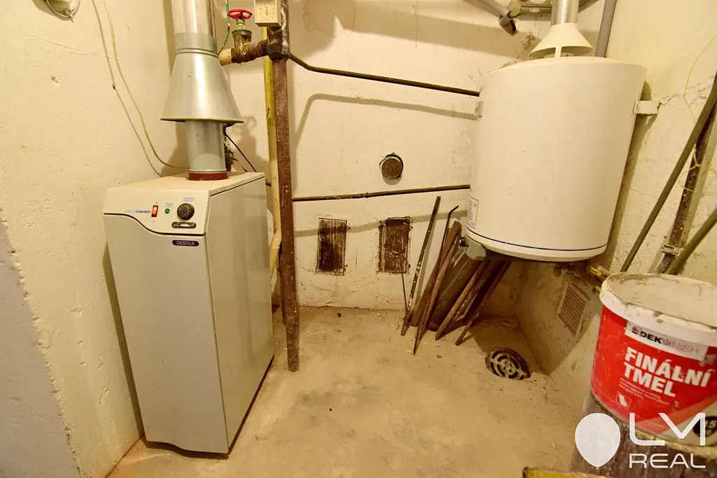 Vytápění topné soustavy je zajištěno plynovým kotlem, ohřev vody zajišťuje bojler. K dalšímu zdroji vytápění se nabízí využít druhého komína a instalovat např. dnes žádaná kamna.