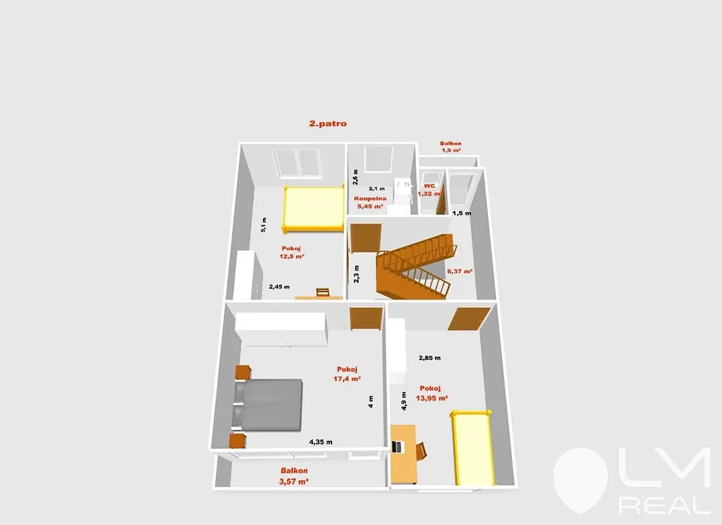 2.NP kuchyně se spíží a jídelním koutem, obývací pokoj, dvě ložnice, balkon,