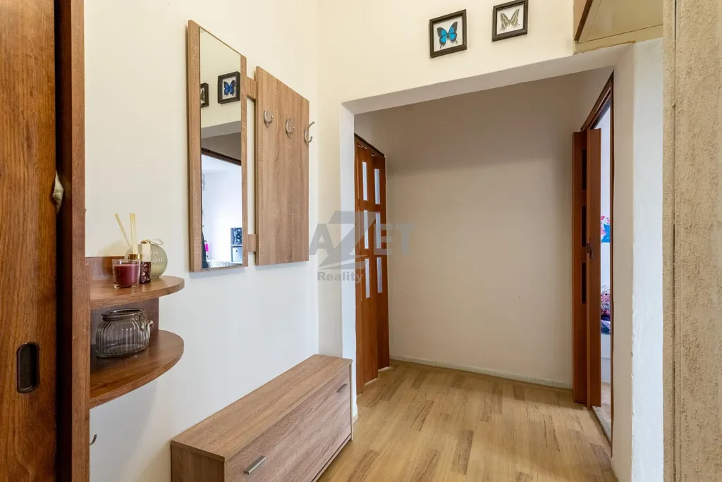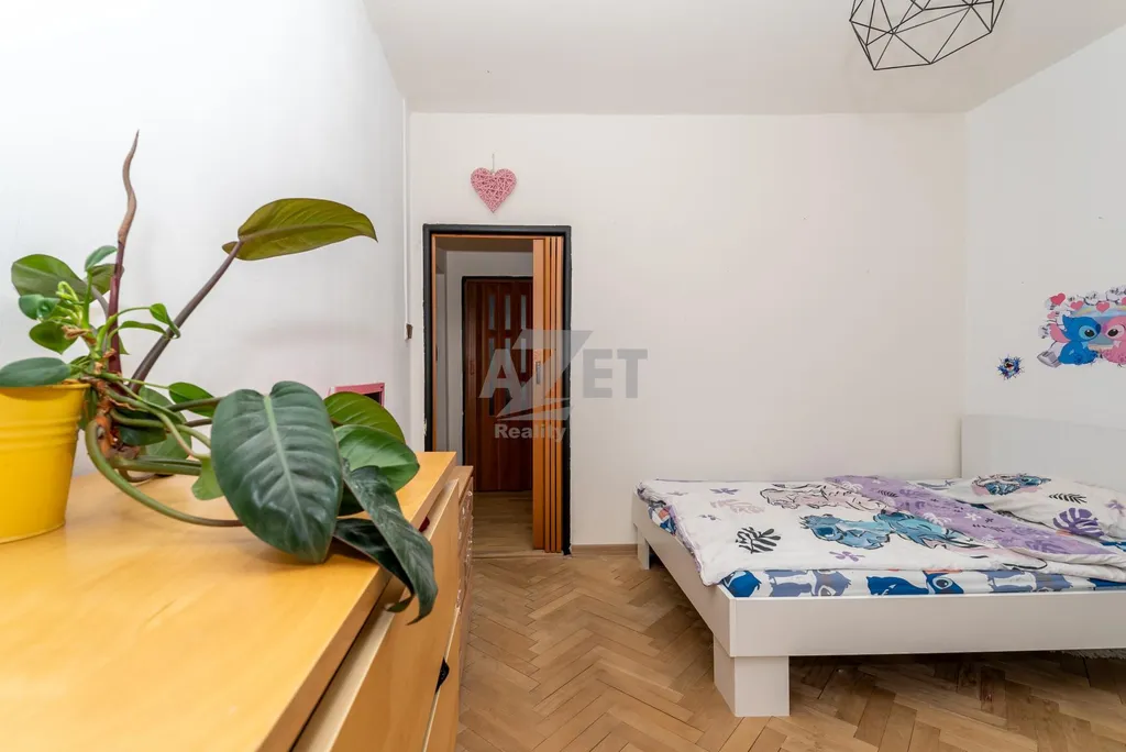 Byt nabízí zajímavý potenciál pro úpravu dispozice například vybudování šatny nebo pracovního koutku v obývacím pokoji.