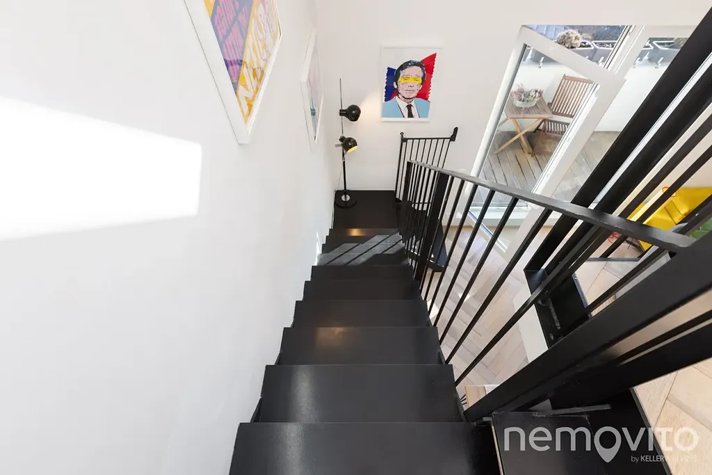 Dole je k dispozici také koupelna se sprchovým koutem a místem pro pračku. Opticky lehké ocelové schodiště ústí v otevřenou galerii. Mezi menší a větší ložnicí je pak umístěno samostatné WC. Díky velkým oknům, která nejsou ničím stíněná, je v bytě skutečně mnoho světla. Sklep o ploše 2 m2 je k dispozici v suterénu budovy. Významným bonusem je pak velká garáž, kterou má tento byt jako jediný.
