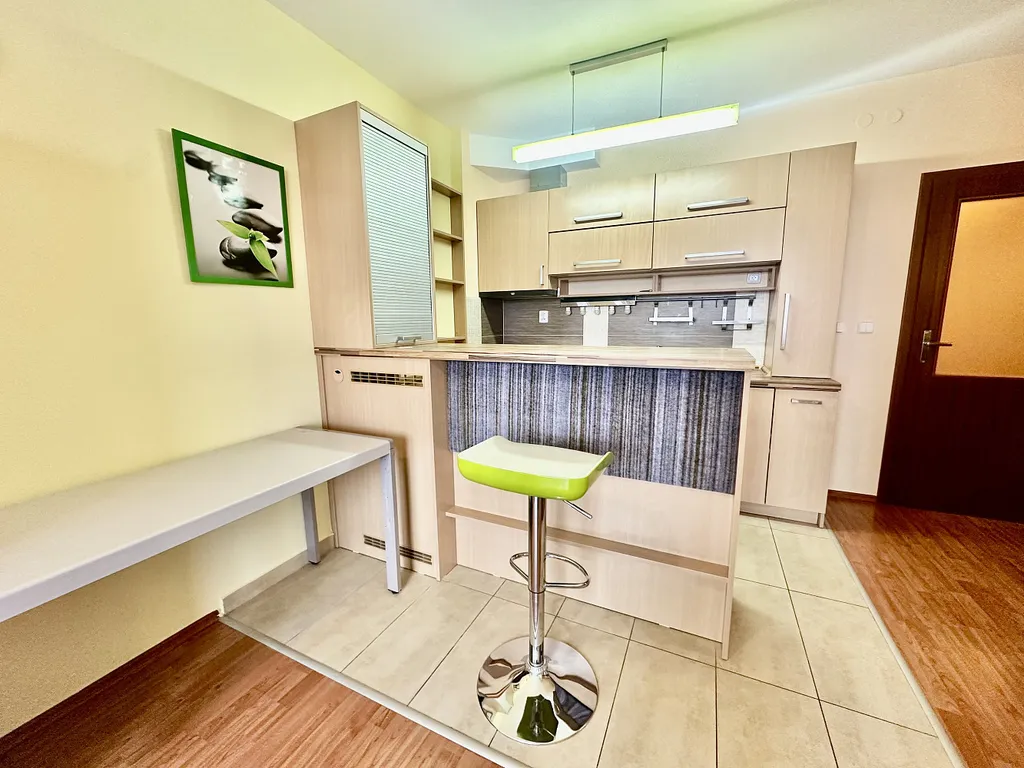Kompaktní 1+kk ideální pro jednotlivce nebo pár, plně vybavené (kuchyňská linka, spotřebiče).