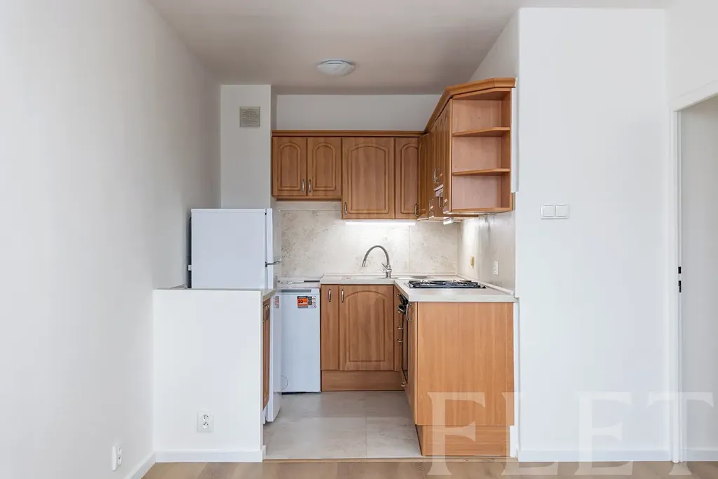 Součástí bytu je obývací pokoj s kuchyňským koutem, který je vybaven lednicí a sporákem. Z této místnosti je přímý vstup na balkón. V kuchyňské části je zároveň umístěna pračka. Koupelna je vybavena vanou a toaletou. K bytu náleží také sklepní kóje, která poskytuje další úložný prostor.
