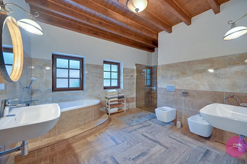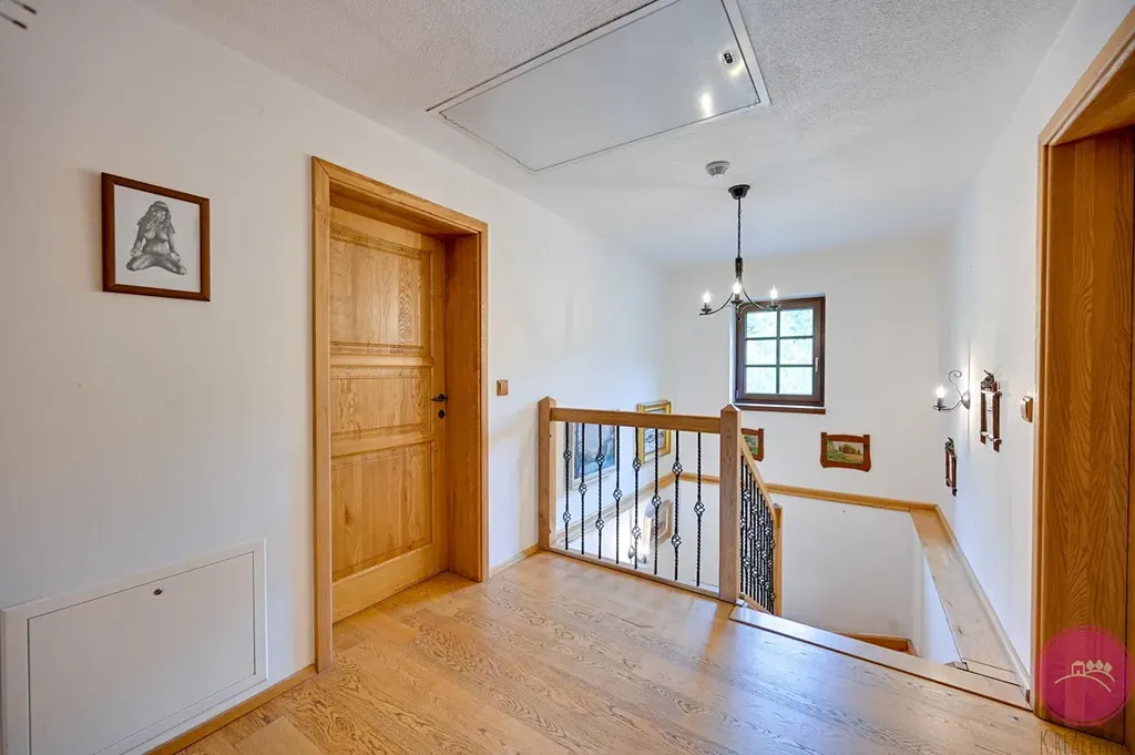 Ve výhradním zastoupení majitele nabízíme k prodeji zcela ojedinělou, nadstandartní nemovitost v obci Oskava, okr. Šumperk, uprostřed obcí Rýmařov, Šumperk a Uničov, do Olomouce 43 km, doba jízdy cca 45 minut autem. Nemovitost se nachází na samotě, na okraji obce, s cca 6000 m2 vlastního pozemku, obklopená lesy. Původní stavba pochází z roku 1923 - 1925, kdy kompletní rekonstrukce, přístavby a dostavba vrchního patra proběhla v letech 2013 - 2015. Při výběru nových materiálů byl kladen důraz především na kvalitu a dokonalost provedení. Inženýrské sítě jsou zavedeny všechny, plyn, elektřina, kanalizace a obecní voda, na pozemku také vlastní studna. Topení v celém domě podlahové, napojené na centrální topný systém - plynové, dále teplovodní vložka do obou krbů, ovládané termostaty a to v každé místnosti, centrální rozvod do topných těles. Dům je napojený na centrální zabezpečovací systém Jablotron, dále kamerový systém HIK CONENCT, internetové připojení řešeno vzduchem. Dům i střecha jsou zateplené. Střešní krytina umělý šindel - došky. Okna plastová s trojsklem. Podlahy dlažba, vrchní patro podlaha dubová, dub - interiérové dveře i obložky. Všechny kovové prvky originální kovářská práce. Nemovitost je částečně podsklepená, ve sklepě umístěn systém na vytápění a úprava na posezení. Nízké měsíční náklady - elektřina, plyn.