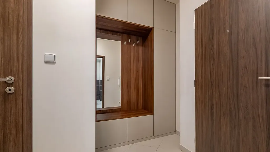 Chodba má dostatek úložných prostor, je zde vstup do komory a další vestavěná skříň na míru.