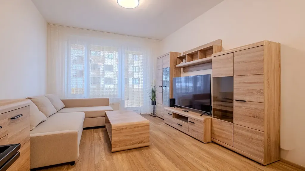 Obytná místnost je prakticky řešená a nabízí dostatek prostoru pro denní činnosti a odpočinek. Součástí je kuchyňský kout vybavený lednicí s mrazákem a vestavěnými spotřebiči, jako je indukční varná deska, elektrická trouba, myčka nádobí a digestoř. Zde je i vstup na východně orientovaný balkón, který poskytuje příjemné místo pro relax.