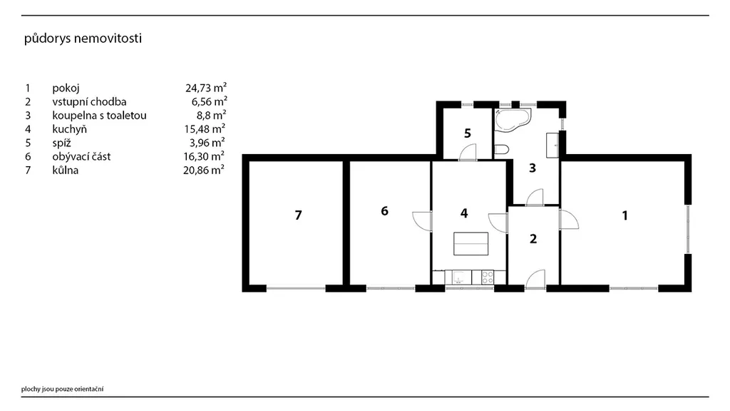 Hlavní dveře vás zavedou do chodby, odkud se vlevo vstupuje do kuchyně – prostorné místnosti s oknem do dvora. Kuchyň je dostatečně velká nejen pro kuchyňskou linku, ale i pro jídelní kout. V její zadní části kuchyně se nachází spíž, ideální pro skladování potravin a domácích zásob. Z kuchyně se prochází do zadního pokoje, komornějšího prostoru, který se přímo nabízí pro vytvoření ložnice či dětského pokoje. Zpět chodbou, napravo, se otevírá vstup do největší místnosti domu, která díky oknům na dvou stěnách působí svěže a světle a je tak ideální jako obývací pokoj. Poslední místností je koupelna, přístupná přímo z chodby naproti hlavnímu vchodu.