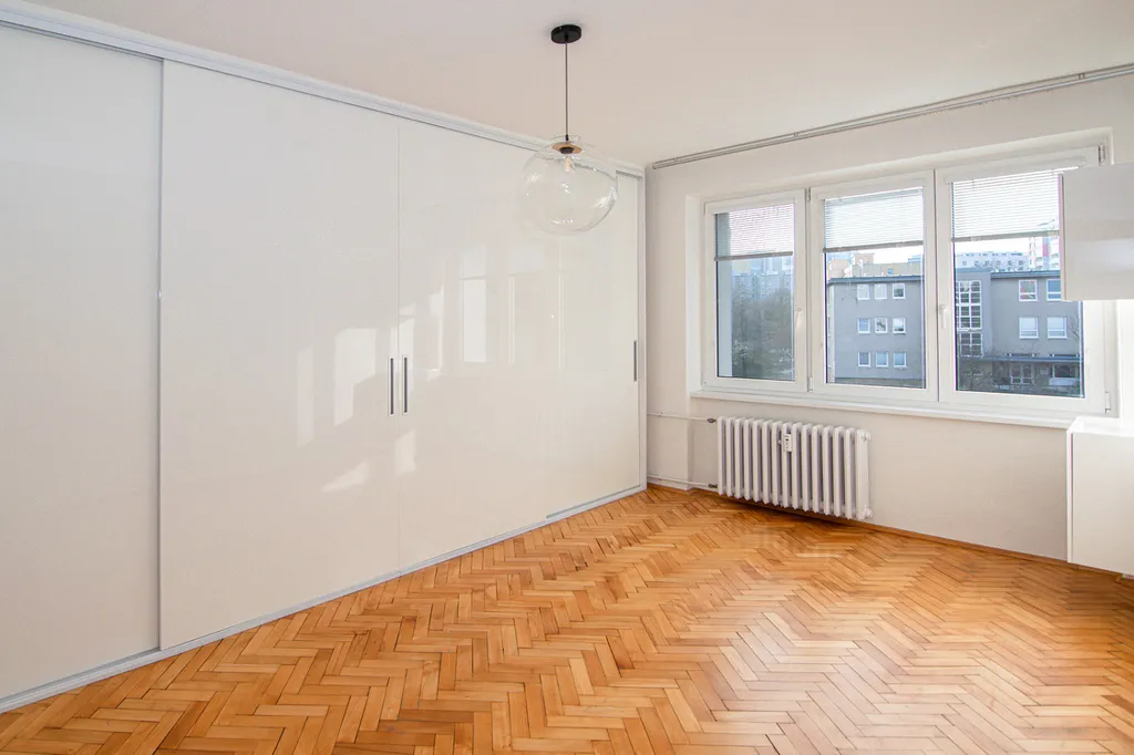 Dále je v bytě prostorná ložnice. Po celé délce jedné stěny je na míru vyrobená šatní skříň.