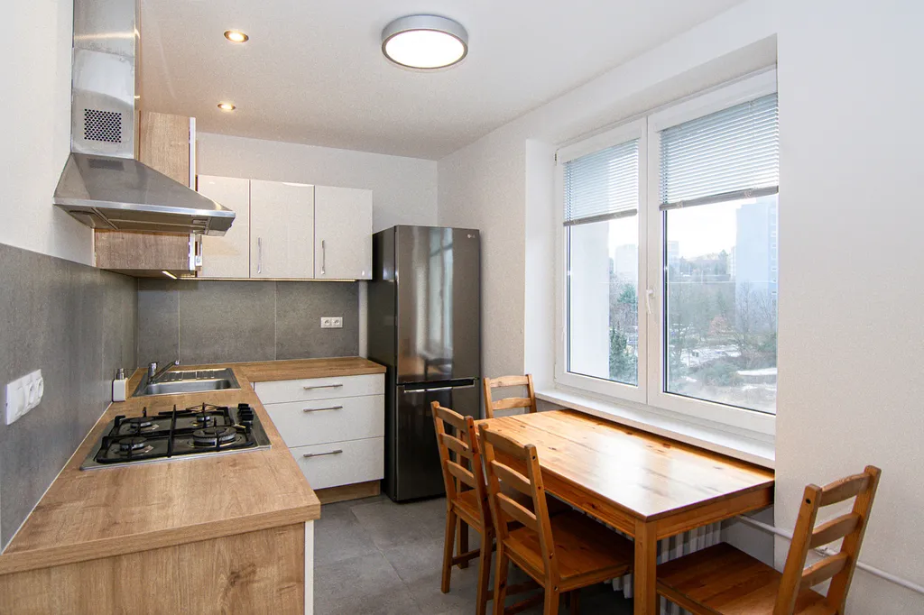 V kuchyni byla instalována moderní kuchyňská linka včetně myčky nádobí, plynového sporáku, elektrické trouby a volně stojící vysoké lednice s mrazákem. Je zde dostatek úložného prostoru. V kuchyni je jídelní stůl pro 4 osoby.