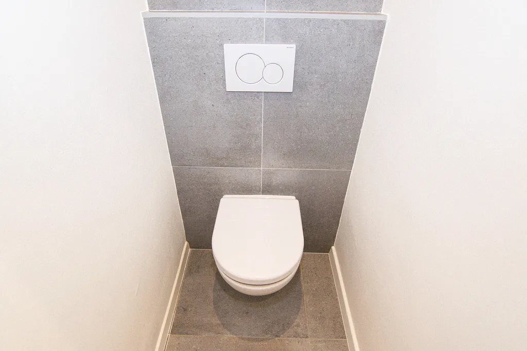 Koupelna disponuje proskleným sprchovým koutem, umyvadlem s úložnou skříňkou, zrcadlem a galerkou. Je zde pračka s vrchním plněním. Toaleta je samostatná.