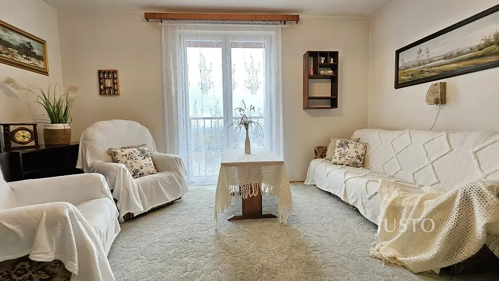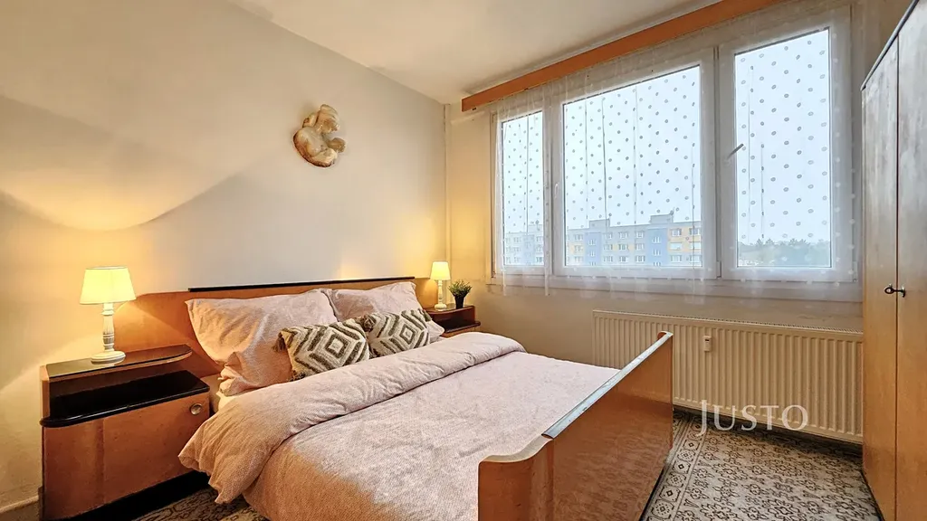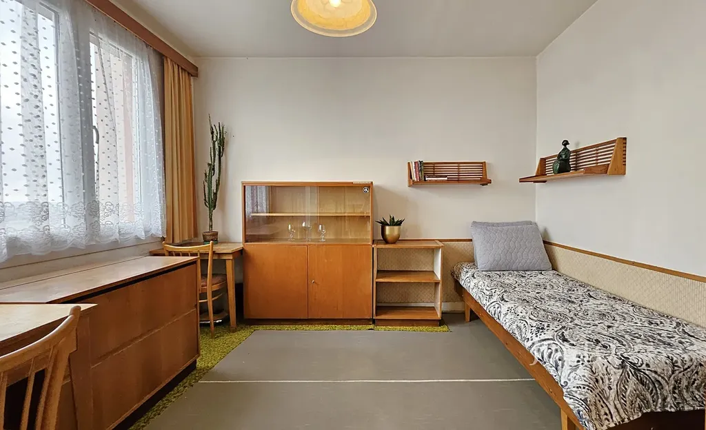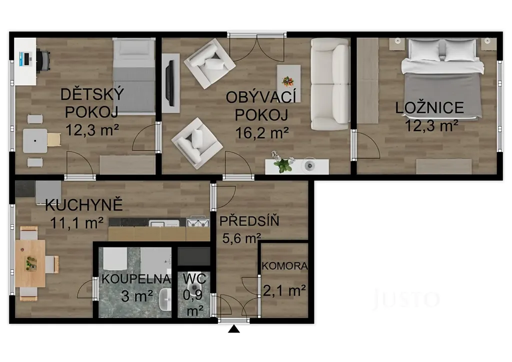 Dispozice bytu nabízí prostorný obývací pokoj (16,2 m²), dva samostatné pokoje (ložnice a dětský pokoj, každý 12,3 m²), kuchyň s jídelní částí (11,1 m²) a předsíň (5,6 m²) s praktickým úložným prostorem/komorou (2,1 m²). Byt je částečně vybaven a připraven k nastěhování či případné modernizaci dle vlastních představ. K bytu náleží sklep, což oceníte pro další možnosti uskladnění.