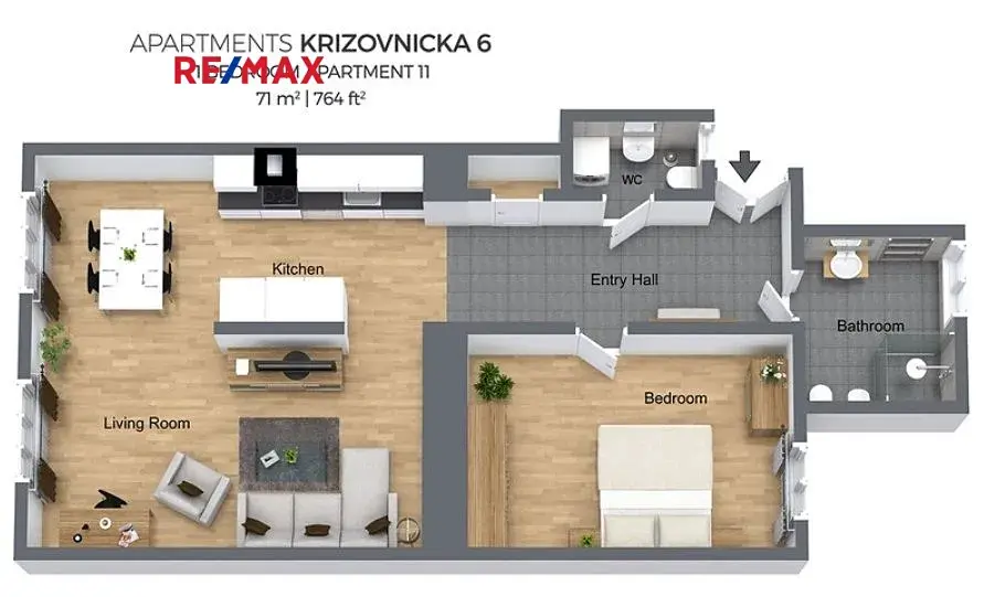 Byt se nachází na 2. podlaží pětipodlažního historického domu s výtahem. Velká okna v obývacím pokoji poskytují nádherný výhled na ulici Křižovnická, na hotel Four Seasons a UMPRUM. Ložnice je orientované do klidného vnitrobloku nabízí ničím nerušený odpočinek.