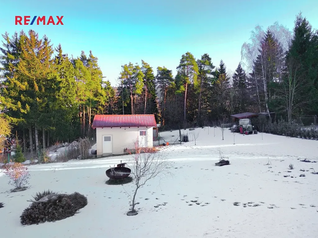 Pozemek je oplocený, svažitý a poskytuje vysokou míru soukromí. K dispozici je terasa o ploše cca 54 m², krytý vyhřívaný bazén 18 m² se slanou vodou a protiproudem, zahradní domek, skleník 3×6 m na betonové podezdívce, vyvýšené záhony, hospodářské zázemí, přístřešek a kotec. Pozemek je osázen ovocnými stromy (jabloň, švestka, třešeň, ořešák). Parkování je možné až pro šest vozidel na vlastním pozemku.