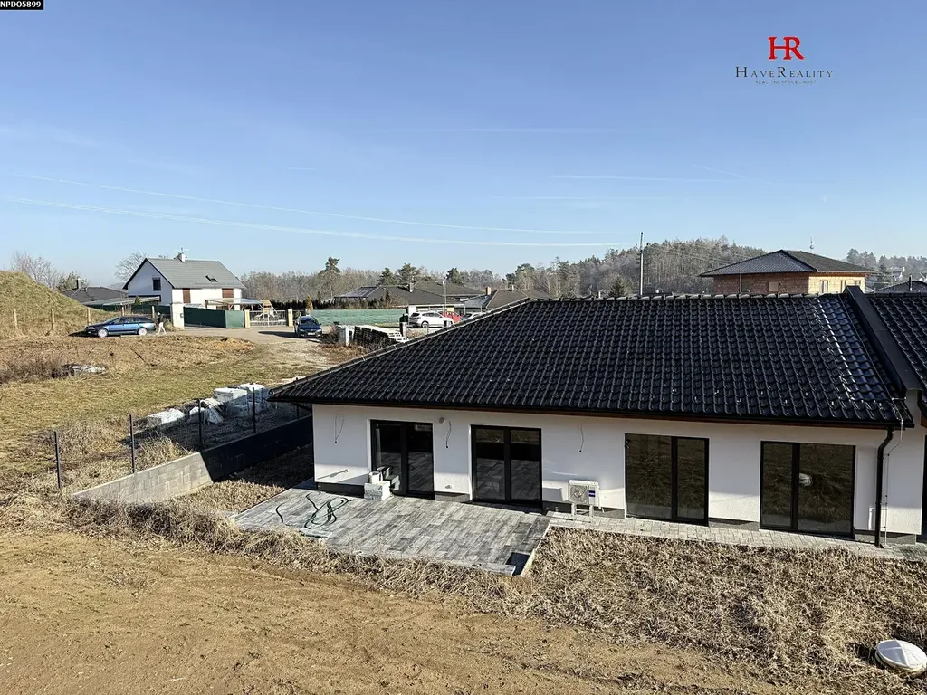 Rodinný dům je přízemní, půdorys má tvar obdélníku. Jedna (kratší) strana domu se dotýká sousedního domu. Zastavěná plocha domu je 155 m2, podlahová plocha 126 m2. Dům je postaven z keramických bloků Porotherm tl. 240 mm, fasáda je zateplena izolací tl. 300 mm, okna jsou plastová s trojsklem, střešní tašky jsou v provedení s glazurou. K výstavbě domu byly použity výhradně kvalitní a moderní materiály. Dispozice domu 5+kk: prostorný otevřený obývací pokoj (35 m2) s kuchyní a jídelnou a se vstupem na terasu, ložnice (15 m2), tři pokoje (od 9 do 14 m2), koupelna se sprchovým koutem, vanou a toaletou (9 m2), samostatná toaleta (2 m2), technická místnost (5 m2) a chodba s navazujícím zádveří. Dům je vytápěn podlahovým topením (elektrické), v obývacím pokoji je klimatizace (chlazení i topení). IS: elektřina 230/400 V, obecní vodovod, obecní kanalizace. Na zahradě je podzemní nádrž na dešťovou vodu. Příjezd k domu je bezproblémový, po obecní asfaltové komunikaci. Parkování na vlastním pozemku, možnost dobudování přístřešku, garáže. Pozemek bude celý oplocen, včetně posuvné vjezdové brány na dálkové ovládání. Přístup na pozemek je zajištěn. Lokalita je klidná, příjemná, zahrada navazuje na rozlehlý les.