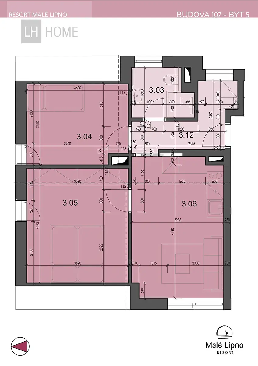 Praktická dispozice 3+kk – prostorný obývací pokoj s kuchyňským koutem a dvě samostatné ložnice