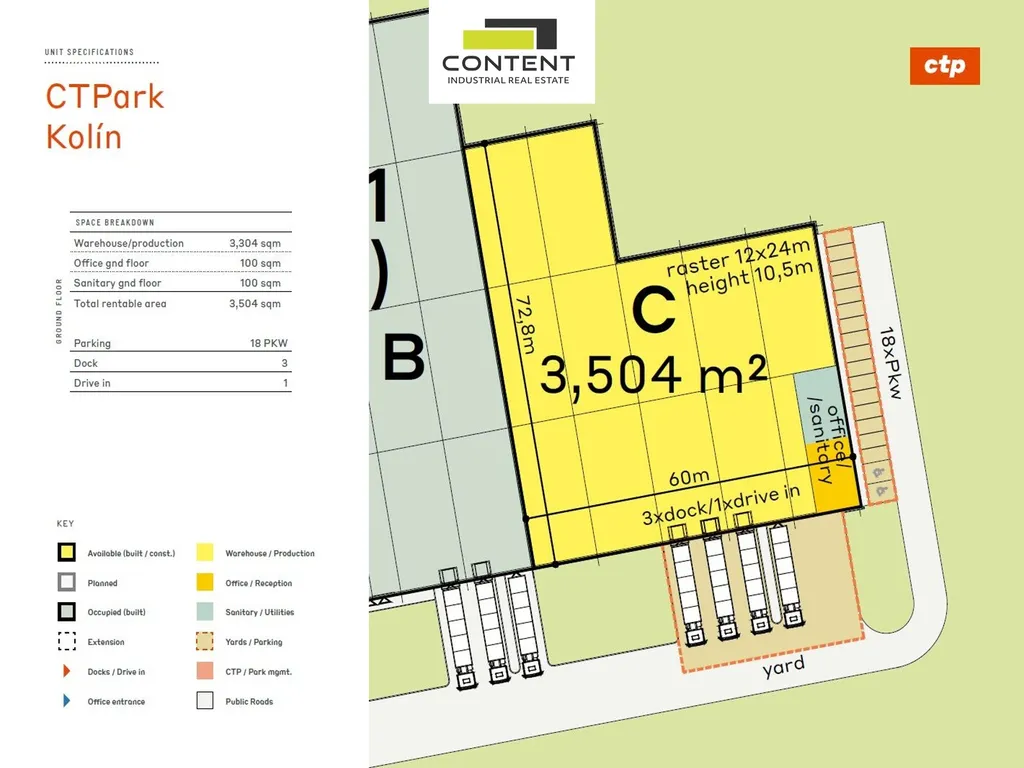 V zastoupení majitele a bez provize nabízíme poslední volné industriální prostory o velikosti 3504 m², umístěné v novostavbě komerční budovy o celkové velikosti 14035 m² v rámci zcela nového industriálního parku, který je v těsné blízkosti výrobního závodu Toyota Motor Manufacturing. Lze je využít především pro skladování a výrobu. Svou polohou mají jednoduché napojení na dálnici D11, EXIT 42 a 50.