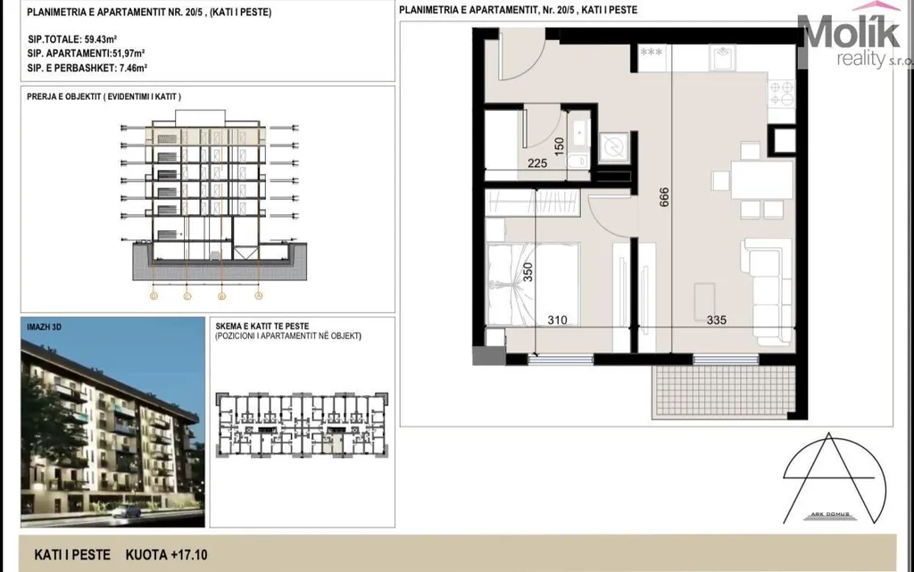 Nabízíme k prodeji apartmán 2+kk o výměře 59,43 m se nachází v 5. patře moderního domu s výtahem. Díky vyššímu patru nabízí byt dostatek světla, příjemný výhled a větší klid. Dispozice je navržena velmi prakticky a zahrnuje obývací pokoj s kuchyňským koutem, samostatnou ložnici, koupelnu s toaletou a vstupní chodbu. Součástí bytu je také balkon, ideální pro ranní kávu nebo večerní posezení.