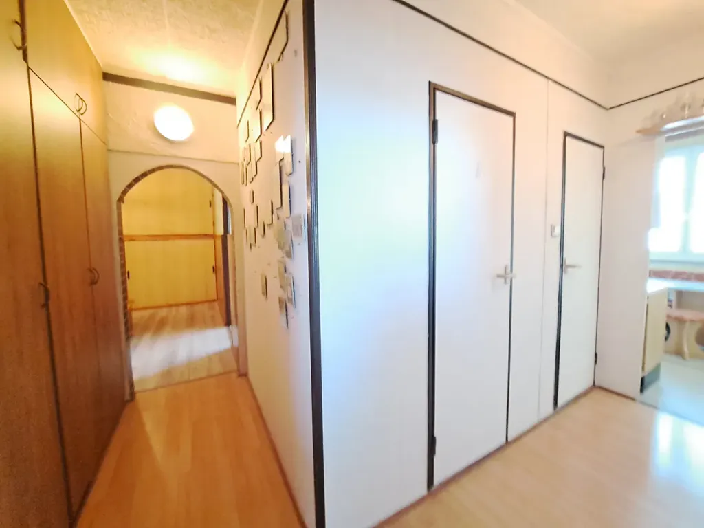 Dispoziční řešení bytu: prostorná vstupní chodba, šatna - vestavěné skříně, obývací pokoj s výstupem na zasklenou lodžii, koupelna (vana se skleněnou sprchovou zástěnou, umyvadlo, místo na pračku), samostatné WC, kuchyň s jídelním koutem, ložnice, pokoj. K bytu náleží sklep. Velká výhoda tohoto bytu je, že všechny místnosti jsou neprůchozí a dále velké úložné prostory v chodbě. V bytě jsou nová okna se žaluziemi, vstupní dveře, podlahy, koupelna je obložena, vestavěné skříně v chodbě, podlaha v lodžii včetně skleněné zástěny apod.