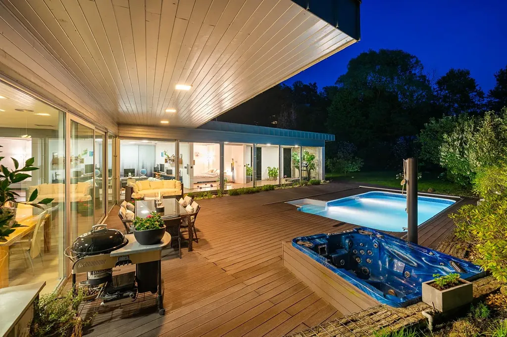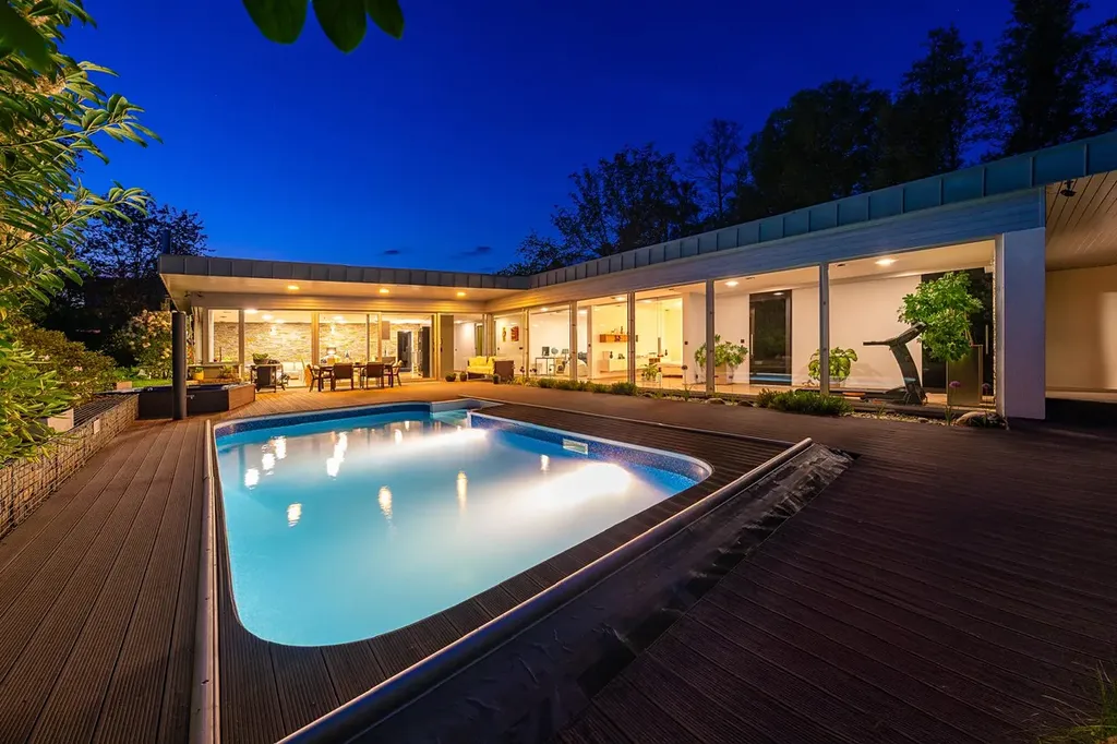 V tomto domě si budete užívat relaxaci na nejvyšší úrovni. Vyhřívaný bazén s protiproudem a venkovní Whirlpool vám umožní dopřát si wellness každý den. Dvě zastřešené terasy, jedna u obývací haly a druhá u ložnice, poskytují klidné místo pro odpočinek v soukromí.