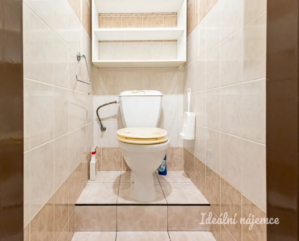 Byt se skládá ze vstupní chodby se dvěma velkými, vestavěnými skříněmi, samostatné toalety, koupelny se sprchovým koutem, pračkou a umyvadlem, ložnice a obývacího pokoje se vstupem na lodžii.