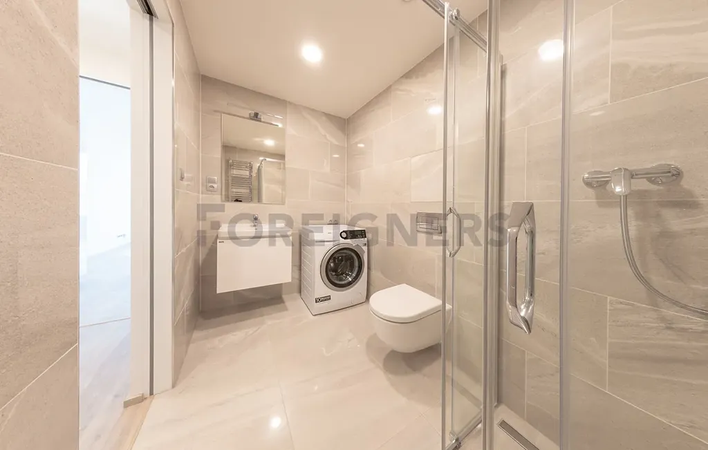 Koupelna: sprchový kout, umyvadlo s poličkou, nad ním zrcadlo a bodová lampa, pračka, toaleta.