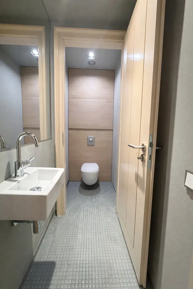 Dispozice bytu nabízí prostorný obývací pokoj s plně vybavenou kuchyní, toaletu pro hosty a otevřenou vstupní halu. Dále je zde hlavní ložnice s en-suite koupelnou (vana se sprchovou zástěnou, toaleta), druhá ložnice, samostatná koupelna se sprchovým koutem, technická místnost, úložná komora a chodba s vestavěnými skříněmi.