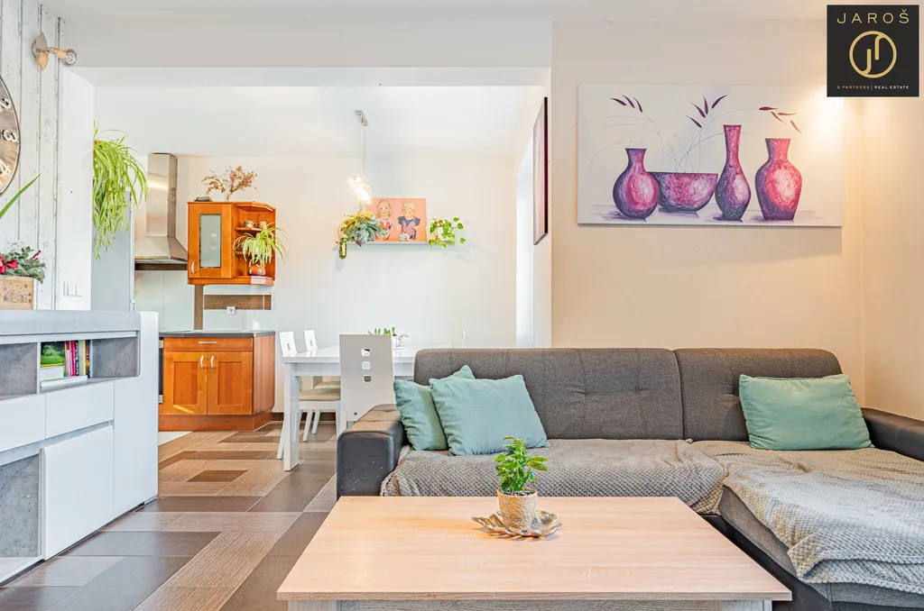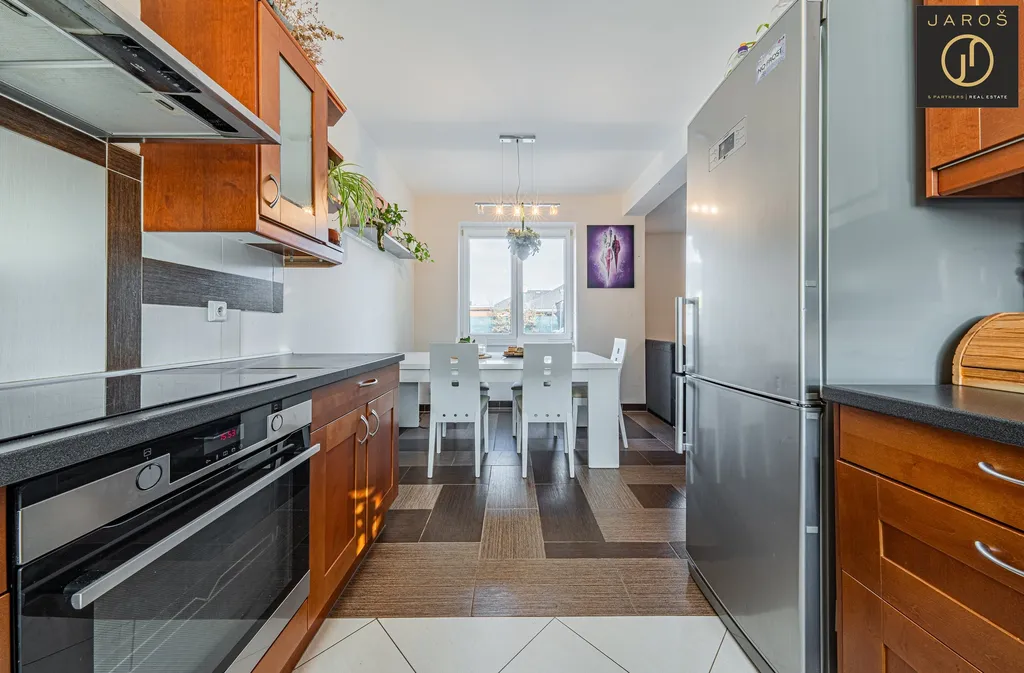 Dispozičně je dům řešen velmi prakticky. V přízemí se nachází zádveří, chodba s vestavnou skříní, samostatné WC, technická místnost, spíž a obývací pokoj s kuchyní a jídelním koutem. Z obývací části je přímý vstup francouzským oknem na terasu a zahradu. V patře je umístěna prostorná koupelna s rohovou vanou, ložnice a dětský pokoj, dále je k dispozici půdní prostor pro případné uložení nepotřebných věcí.
