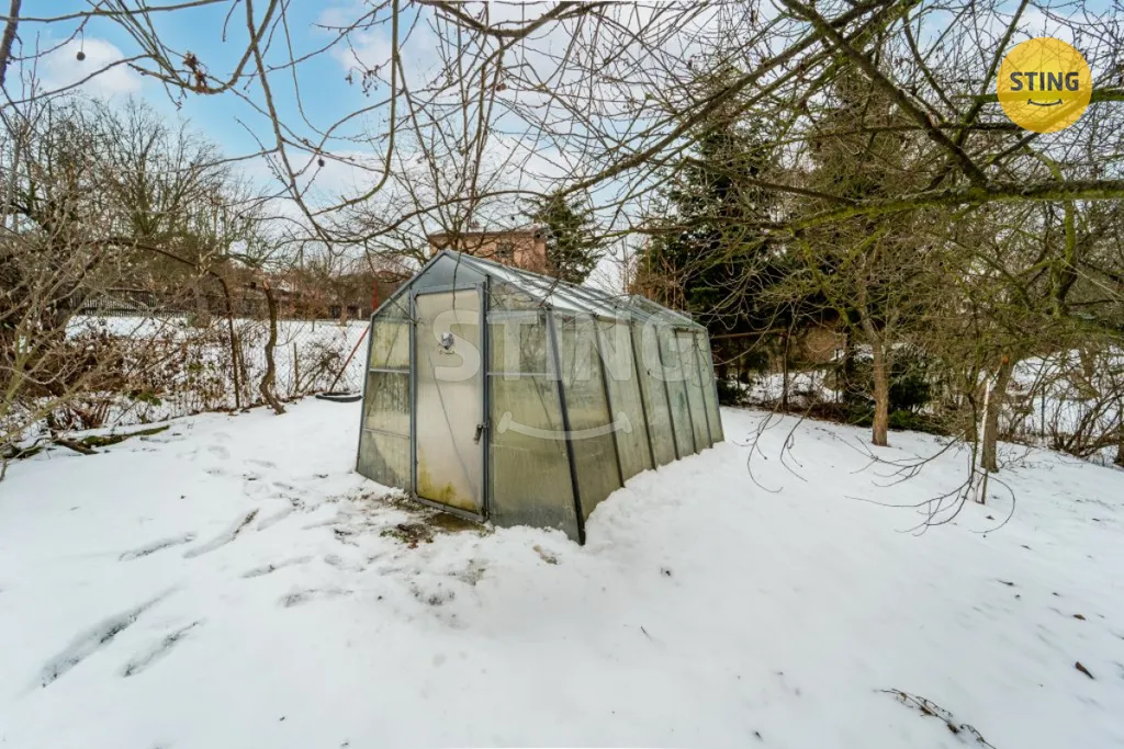 Na zahradě stojí hospodářská budova s chlévem a kurníkem, a na ni navazující garáž s dílnou a prostorem pro uskladnění ovoce na straně jedné a krytou pergolou s krbem na straně druhé. Prostor za hospodářskou budovou tvořil výběh pro slepice z kurníku.
