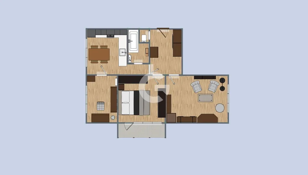 Dispozice bytu je velmi praktická a vzdušná. Nabízí tři neprůchozí pokoje, které jsou v současnosti využívány jako ložnice se vstupem na zasklenou lodžii, obývací pokoj a pracovna. Toto uspořádání zajišťuje dostatek soukromí a flexibility. Součástí je zasklená lodžie o ploše 3,5 m², ideální pro posezení či relax, a sklep o velikosti 4,5 m², který poskytuje dostatek úložného prostoru. Byt je orientován na jihozápad, což zajišťuje dostatek denního světla po většinu dne.