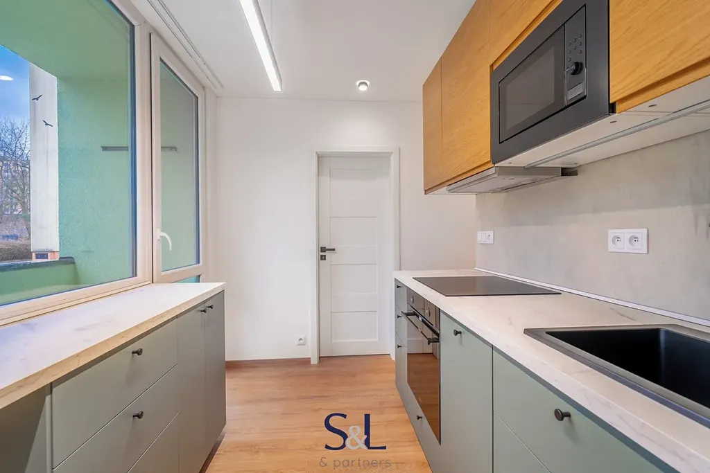 Dispozice bytu nabízí prostorný obývací pokoj, ložnici, kuchyni s novou kuchyňskou linkou a vstupem na lodžii, luxusní koupelnu se sprchovým koutem, samostatnou toaletu a komoru.