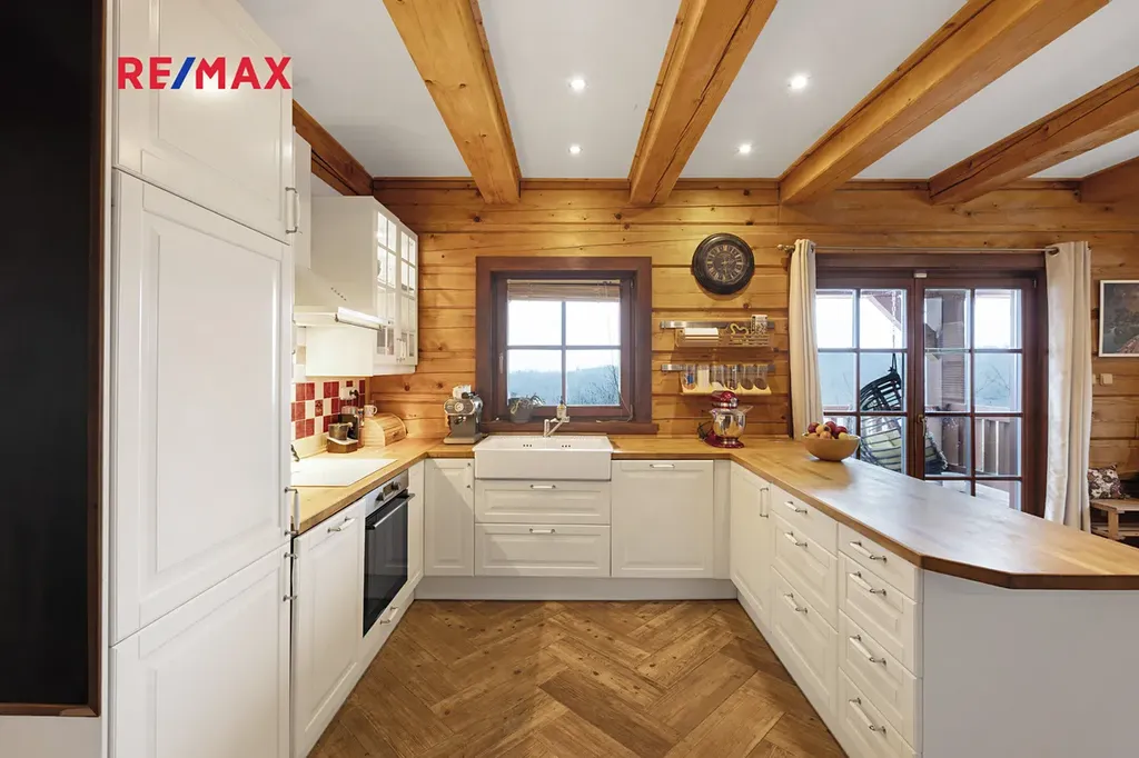 V přízemí se nachází vstupní zádveří s prostorem pro uložení bot a oblečení, koupelna, technické zázemí a velká komora vhodná například pro skladování potravin nebo zavařenin. Hlavní část přízemí tvoří prostorný otevřený obytný prostor s kuchyní, jídelnou a obývacím pokojem. Dominantou obývací části jsou kachlová kamna na dřevo, která slouží jako plnohodnotný zdroj tepla a zároveň vytváří velmi příjemnou atmosféru.