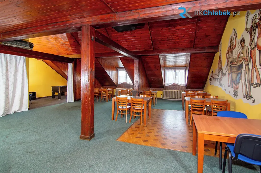 Prostorná restaurace v přízemí i v patře s kompletním zázemím pro provoz (kuchyně, nákladní výtah, sklady, sociální zařízení) vinárna, bar, venkovní posezení, kanceláře, bytová jednotka, velký společenský sál vhodný pro pořádání svateb, oslav, konferencí a firemních akcí.