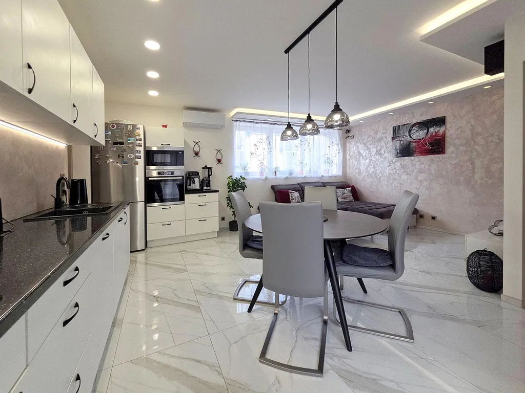 Moderní povedená dispozice bytu je podtržena přímým výstupem na velkorysou zahradu o rozloze 230 m², která je oázou klidu a relaxace.